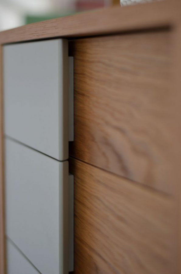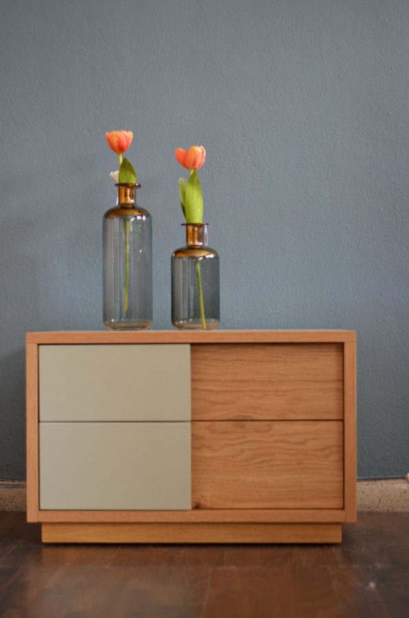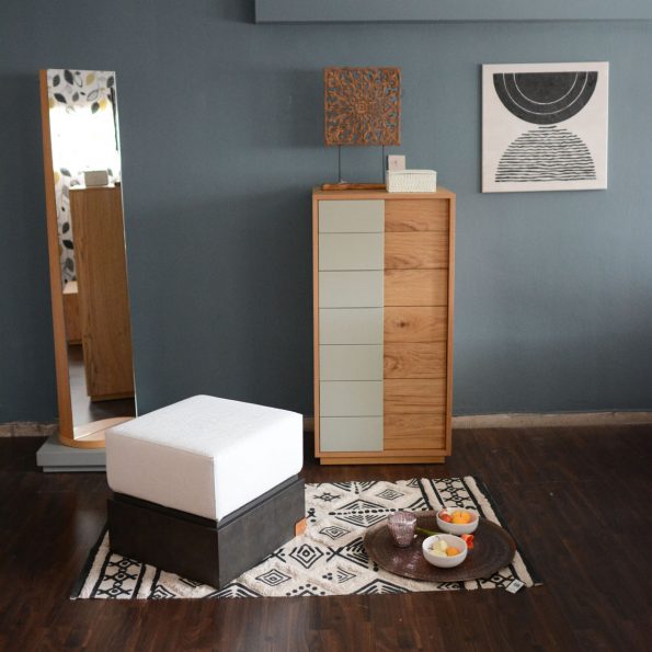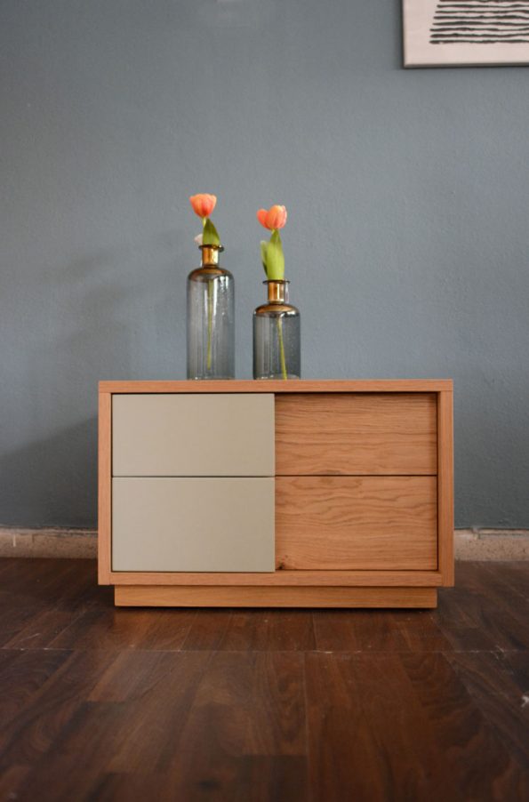 To ομώνυμο κομοδίνο προσφέρεται σε διαστάσεις 60 x 45 εκ., επενδεδυμένο με καπλαμά δρυς vintage και λεπτομέρεια λάκας! Διαθέσιμο σε διάφορους χρωματισμούς και σε διάσταση 50 x 45 εκ. Αντίστοιχα, η συρταριέρα είναι κατασκευασμένη από τα ίδια ποιοτικά υλικά όπως και τα κομοδίνα, με διαστάσεις 60 x 45 εκ.