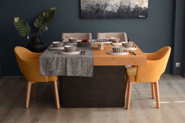 Το τραπέζι έχει διάσταση 120×120 εκ., ενώ για όσους επιθυμούν υπάρχει η δυνατότητα να κατασκευαστεί σε διάσταση 180×100 εκ. Είναι ανοιγόμενο με 3 φύλλα, διάστασης έκαστο 50 εκατοστά. Το καπάκι είναι κατασκευασμένο από MDF και δρυς, με ρουστίκ καπλαμά, ενώ η βάση έχει κατασκευαστεί με υλικά της Cleaf.